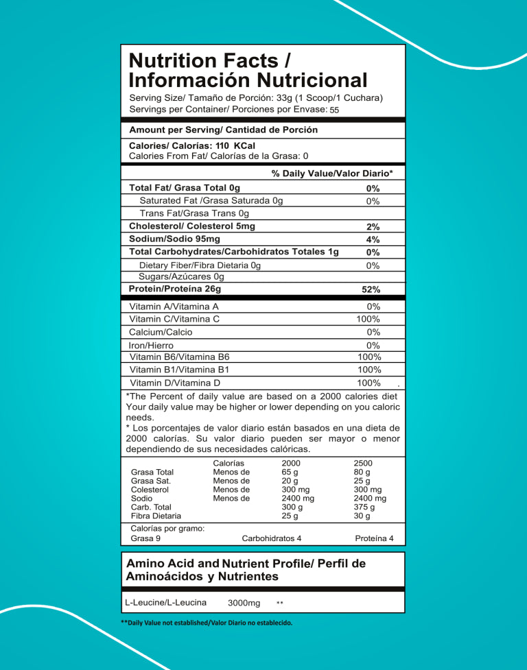 -Proteína aislada de suero de leche de alta calidad, caseína micelar y leucina.